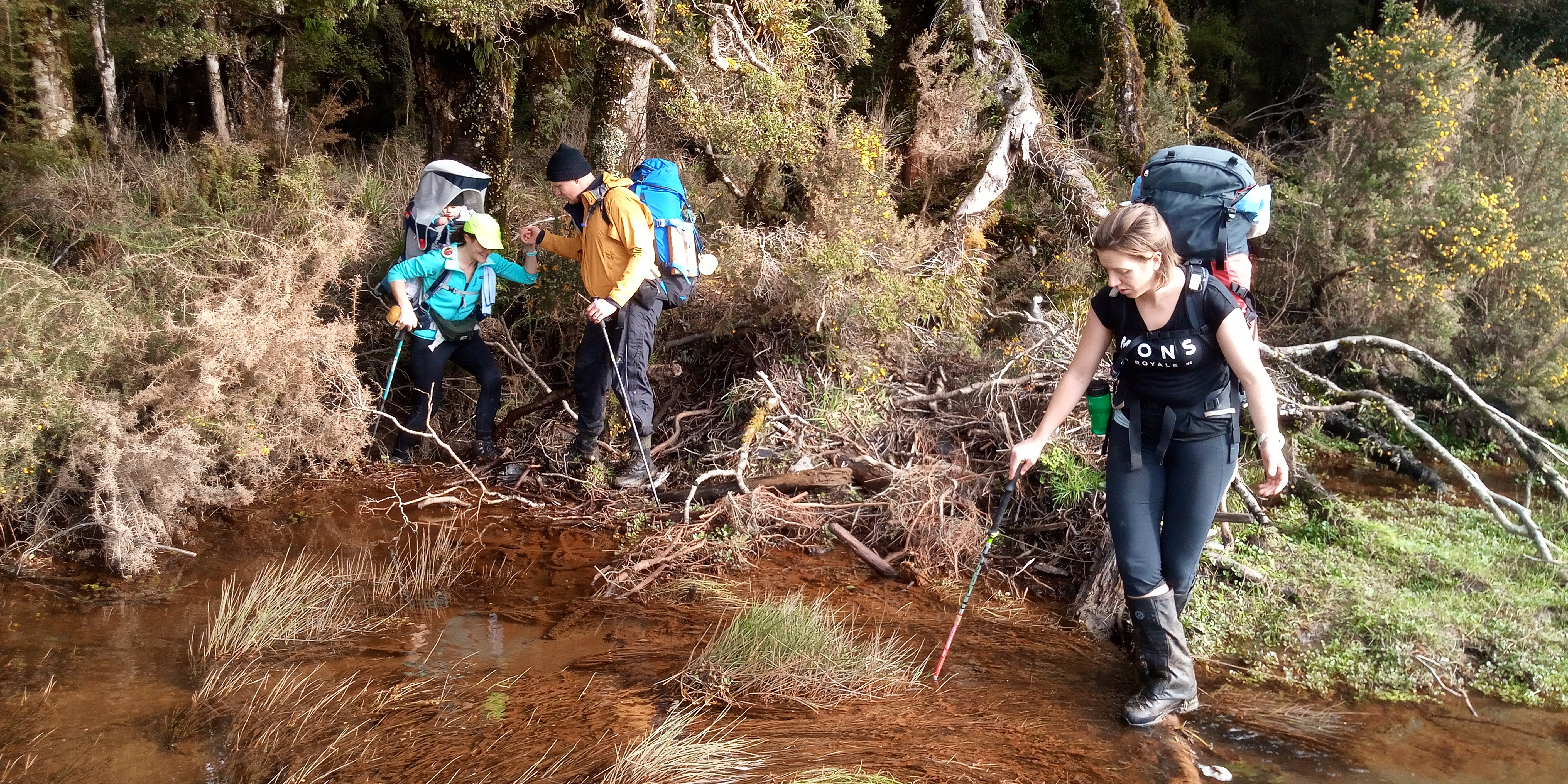 The track re-enters the forest now and again, crossing a few boggy side creeks. Some inventiveness is required to avoid the worst of the bog, but it’s all part of the fun!