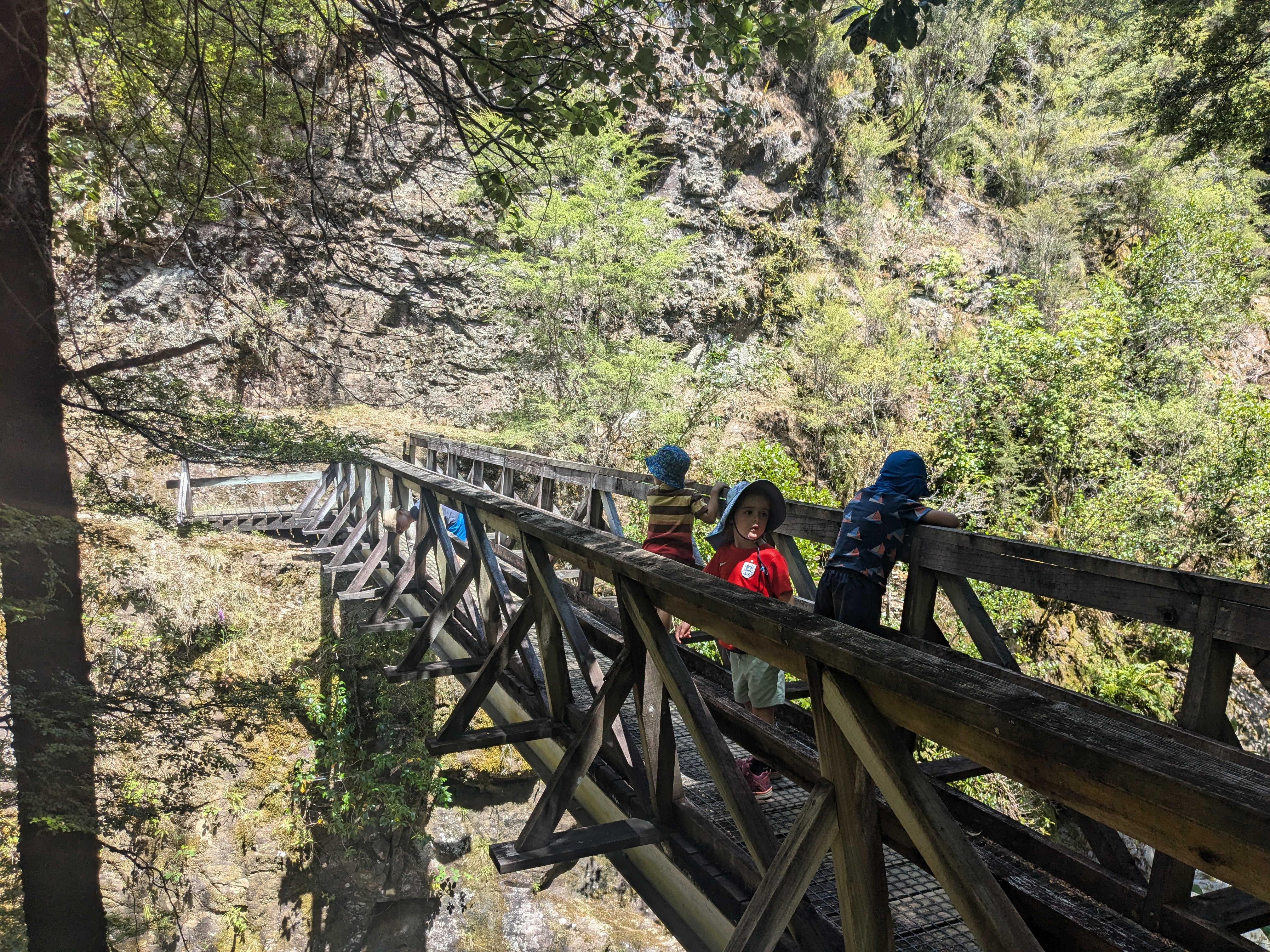 2hr adult walk, about 7km, to a lovely hut in a clearing. Mostly in bush, while it follows a river valley up, you don’t actually access the river until the hut. Took a bunch of 4 – 6 year olds about 3.5hrs each way.