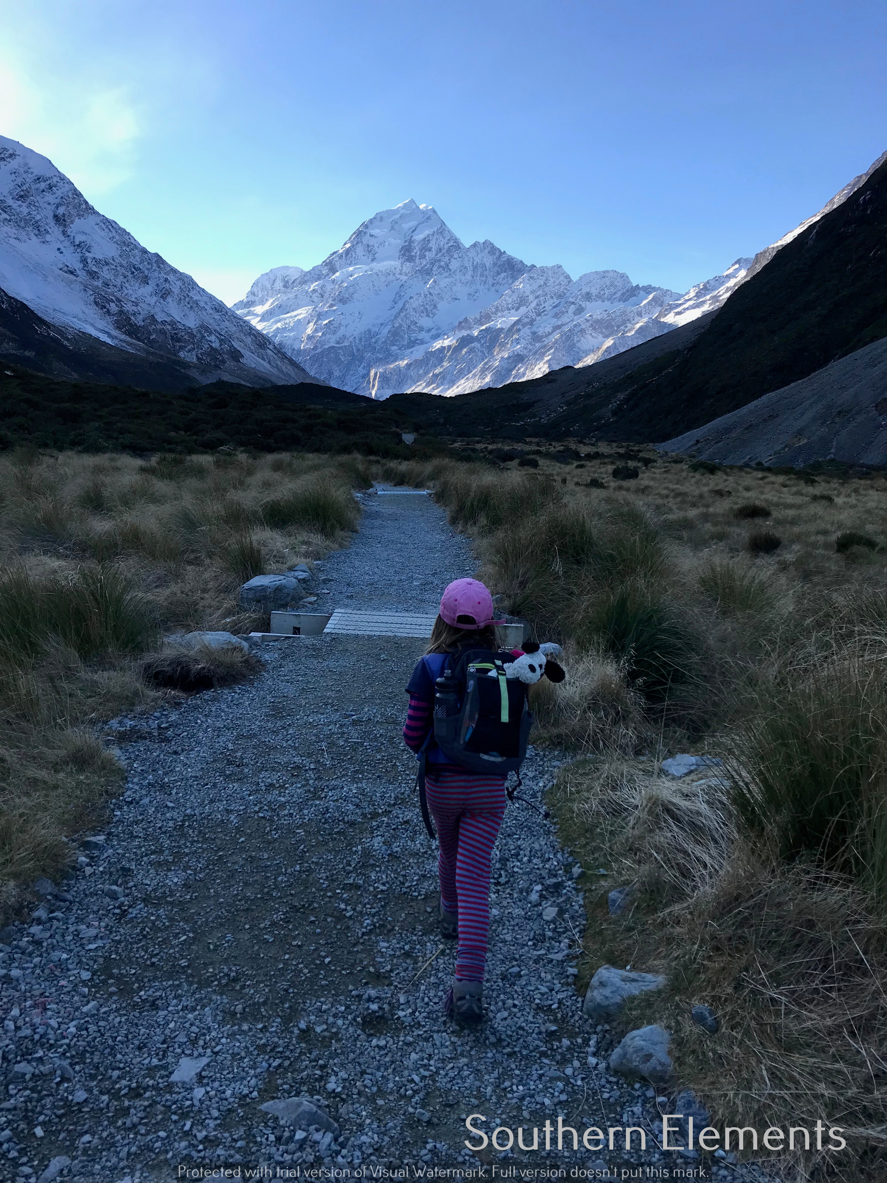 The Track: About 4km along the Hooker Valley track. The track is excellent condition on a busy track, with two massive swingbridges. The track to the hut follows the creek bed at Stocking Stream and has deliberately not been highly marked to prevent day-walkers from visiting a lot. Follow the stream bed up and look for the markers to back track up to the hut. Couldn’t give a precise time as we had the gift of time and so the kids played a lot in both directions.