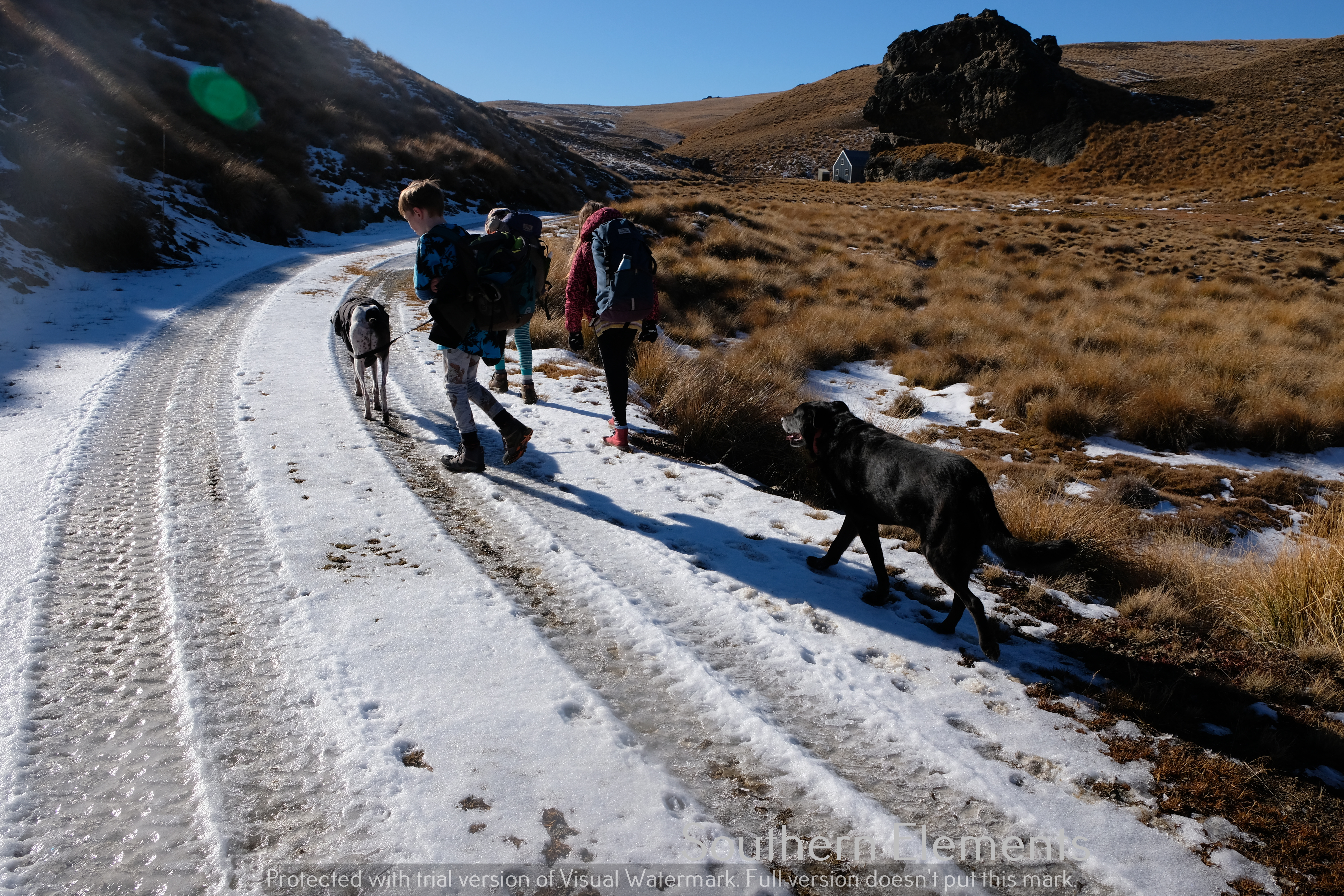 A very gentle, easy 3.5km walk, initially downhill amongst cross country ski trails, then into wee mini-valley, still following a ski trail, beside a bubbling brook for the last part. An ideal first tramp for little legs and really cruisey for older kids. We headed there with a bunch of school age kids, left late morning, lunch at the hut and then explored for the afternoon. Took about 1hr for this age group. Can also be biked, or cross country skied or snow shoed in winter.