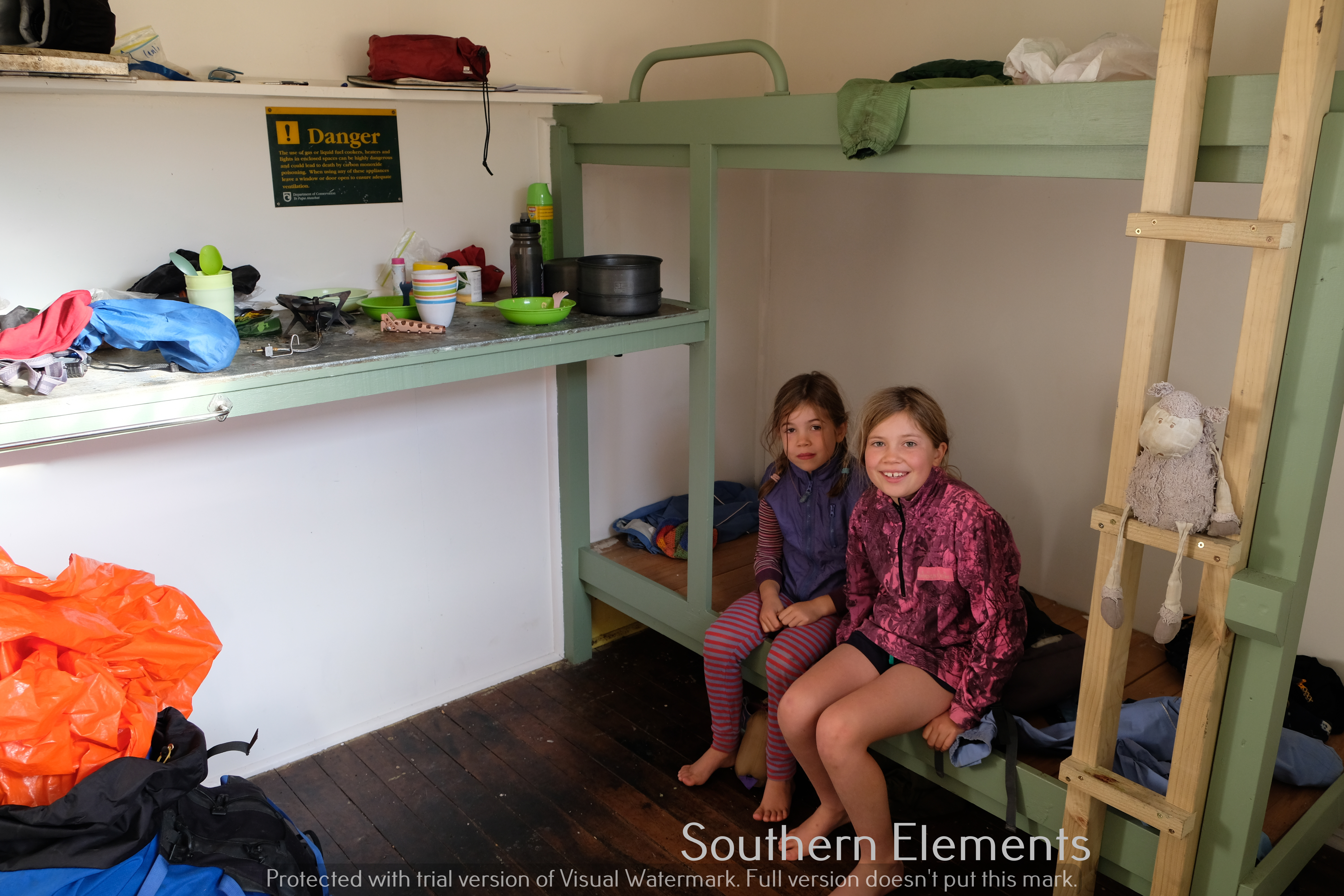 The Hut: 2 bunker! We took mattresses and kids slept on them on bunks and we had hut mattresses on floor (plenty of room for this). Old school open fire place but still produces enough heat as hut is pretty good nic. Has fire guard 🙂 Wee stream close to hut for water and playing.
