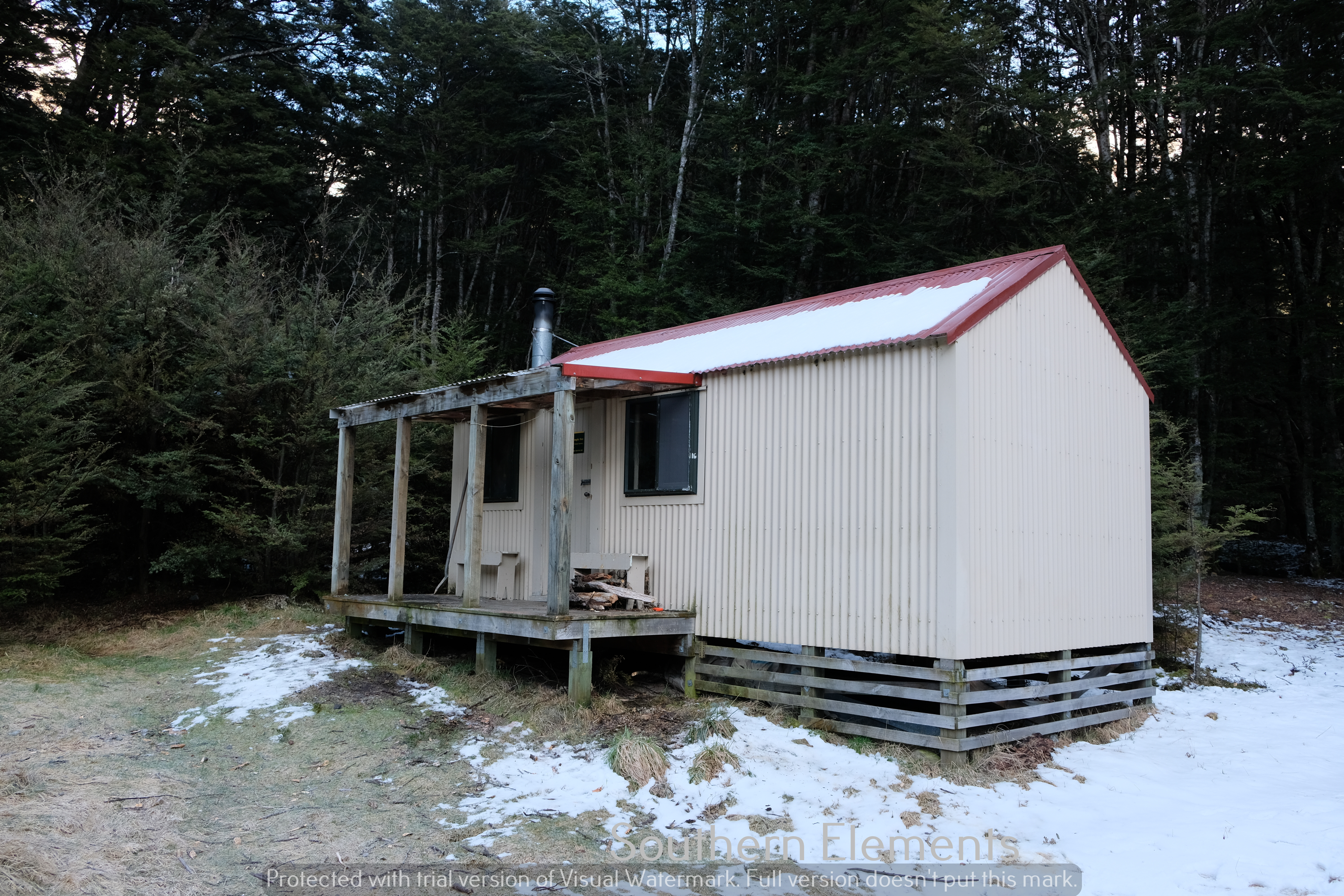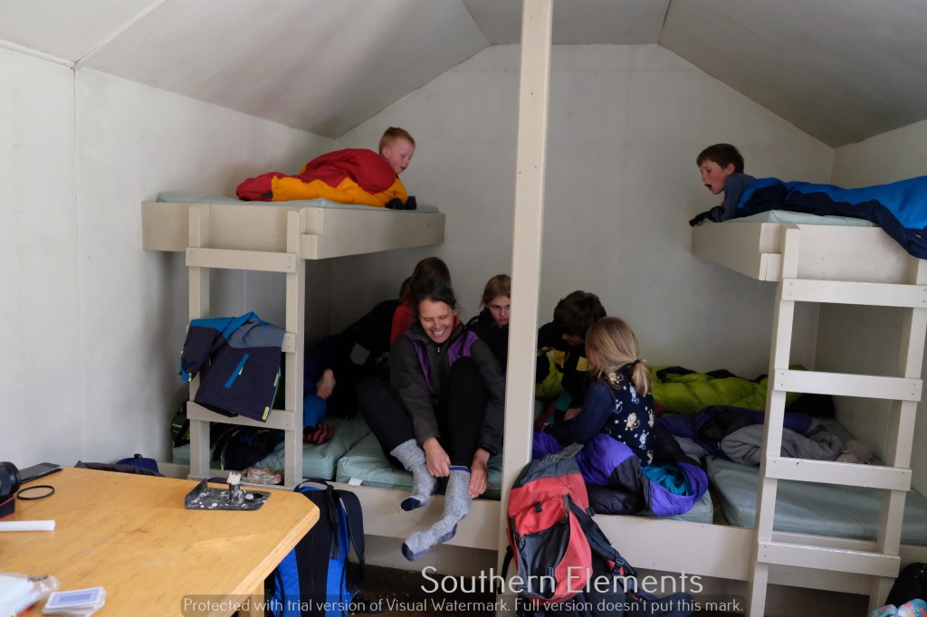 Hut features: This a 6 bunk hut with a platform bunk across the bottom and 2 top bunks. The hut space is relatively large for a 6 bunk hut. We had 3 adults and 7 kids in there without much difficulty but we were all from the same party. Woodburner which kept us warm, good woodshed outside which had plenty of dry wood when we arrived. Water supply is the river, about 50m from hut. Windows have fly screens.